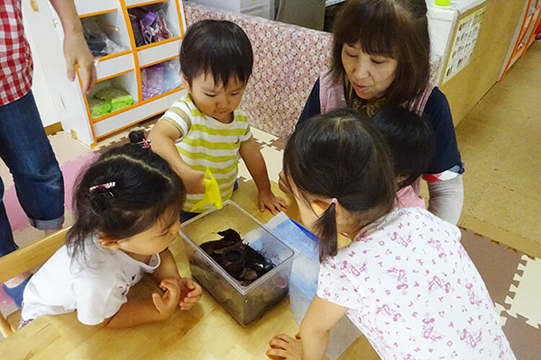 毎日手作りの給食・おやつで「楽しく食事」を大切に。間近で作っているところを見て、食への興味を広げます。